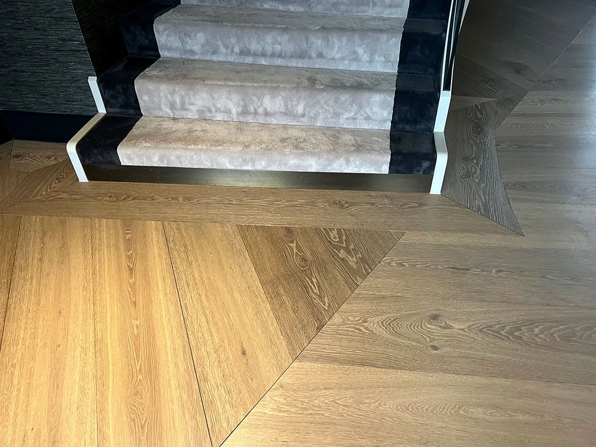 We walked and we talked, we talked and walked some more and what you see is what we did. A central spine linking front to back and side to side. 3 mt chevron staves at a width of 302 mm laid at 32.5 degrees. 4 chevron bays occupy the eye as you enter the home. The spines are detailed with the same 32.5 degree angle of the chevron. The 302 mm plank border is mitred to perfection. 600 mm width border plank curved to replicate the stringer sweep and curved borders under the stairs with flush fitting inset lights. 10 mm inset brass lines the border to the wine room.